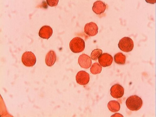 Grains de pollen observés au microscope : coloration à la safranine, X600