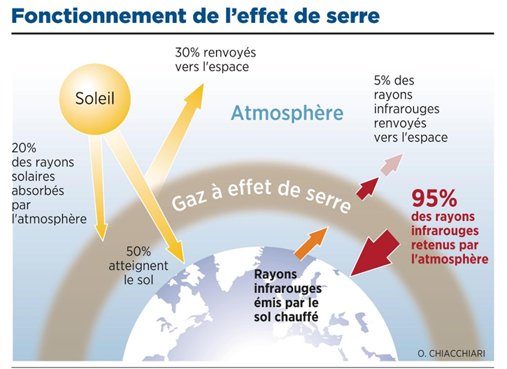 Certains gaz permettent de filtrer et d’absorber des rayonnements solaires et infrarouges : c’est l’effet de serre. Il permet d’atteindre une température sur Terre de 15°C.