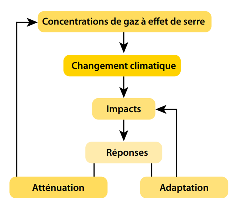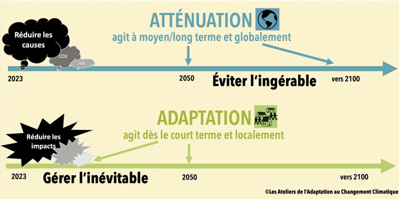 L’atténuation traite des causes du changement climatique (l’accumulation de gaz à effet de serre dans l’atmosphère), alors que l’adaptation concerne les impacts du changement climatique.