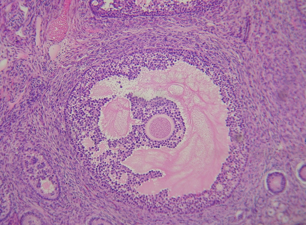 Photographie d’un follicule (ovule + cellules le protégeant) observé au microscope optique au grossissement x10x10